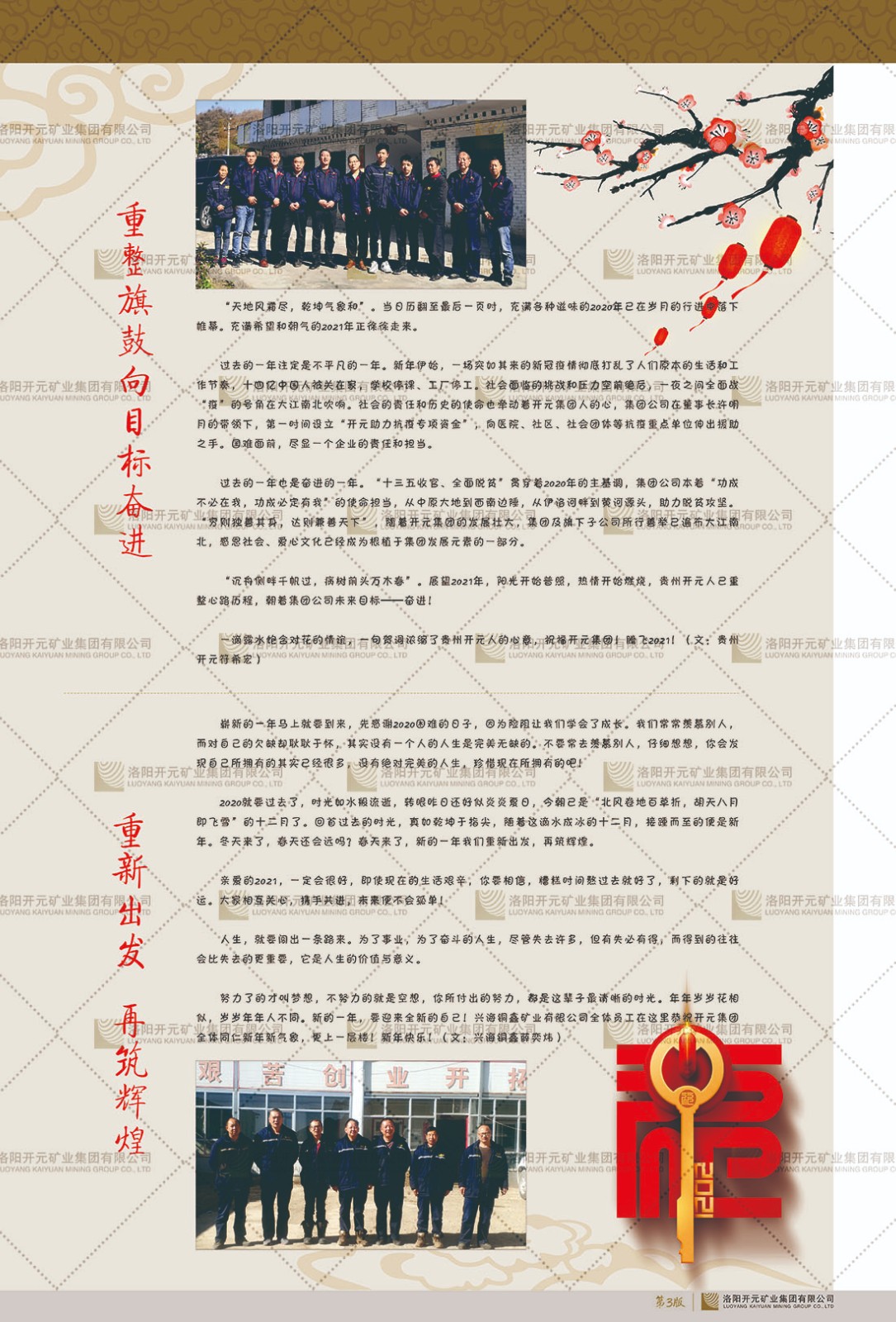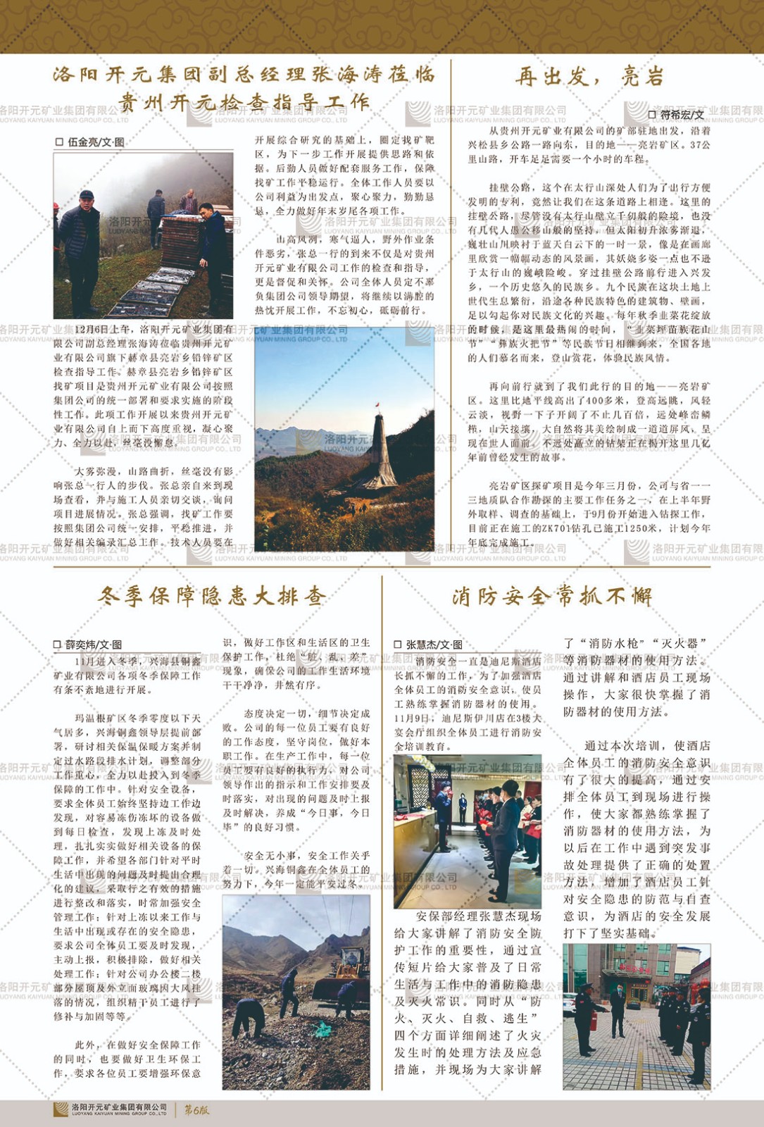 洛陽開元礦業(yè)集團有限公司簡介洛陽開元礦業(yè)集團有限公司,始成立于2006年,位于洛陽市開元大道269號。集團旗下共有十余家全資子公司,業(yè)務涉及有色金屬礦山開發(fā)、礦產(chǎn)品購銷與進出口貿(mào)易、房地產(chǎn)開發(fā)、文化藝術、企業(yè)管理與咨詢、資本投資等多個領域。2024年,集團公司銷售總額達7.8億元。民建河南省委委員、民建河南省委企業(yè)委副主任、民建洛陽市委委員、企業(yè)委主任、洛陽民建企業(yè)家協(xié)會會長許明月是公司創(chuàng)始人,現(xiàn)任洛陽開元礦業(yè)集團有限公司董事長。在礦業(yè)領域,洛陽開元礦業(yè)集團擁有多家實力雄厚的子公司:貴州開元礦業(yè)有限公司探、采礦權面積共11.33平方公里;興??h銅鑫礦業(yè)有限公司探礦權面積8.76平方公里,礦山資源潛力巨大;2021年,開元集團與盧氏中科礦業(yè)有限公司開展戰(zhàn)略合作。盧氏中科礦業(yè)有限公司專注于有色金屬的浮選、加工和銷售,擁有強大的技術支撐平臺,是集探、采、選、冶、研為一體的中大型綜合礦業(yè)企業(yè)。目前,盧氏中科王家河1000噸選礦廠已成功投產(chǎn),雙河金礦、柳關欒盧鉛鋅礦相繼順利開工,樓房銀礦與圪老灣鉛鋅礦的深部探礦重大突破,標志著礦山版圖取得重大進展,為開元集團后續(xù)發(fā)展奠定了堅實基礎。在文化傳媒領域,洛陽市明月美術館通過豐富多樣的藝術展覽、學術研討和公共教育活動,努力打造一個集展覽、交流、教育、研究為一體的綜合性藝術平臺。此外,在金融投資領域,開元集團旗下的北京明峰資本管理有限公司專注于投資具有高增長潛力的優(yōu)秀企業(yè),特別是高科技、新能源、環(huán)保等新興產(chǎn)業(yè),為客戶提供個性化的資產(chǎn)配置服務。在做好企業(yè)經(jīng)營的同時,開元集團始終不忘企業(yè)的社會責任和家國情懷,以突出的愛心公益事跡,開展了一系列公益慈善活動:“民建林”公益事業(yè)通過“思源基金”“幫幫公益”線上公益平臺,與眾多愛心人士籌措資金20余萬元;資助541名貧困大學生共計270余萬元,推進“數(shù)字助力——河南AI人才培養(yǎng)”;捐款10萬元,馳援京津冀、黑龍江洪水地質(zhì)災害……公司于2017年底被洛陽市慈善總會評為“洛陽慈善風云榜——十大愛心集體”。洛陽開元礦業(yè)集團有限公司秉承持續(xù)發(fā)展理念,憑借多年來良好的企業(yè)信譽與經(jīng)營業(yè)績,與全國多家企業(yè)建立了良好合作關系,受到社會各界的一致好評,多次榮獲“納稅標兵”“先進企業(yè)”“招商引資模范企業(yè)”等榮譽稱號。回望來時路,開元人勠力同心,以“闖”的精神和“創(chuàng)”的勁頭,一路披荊斬棘,踏過千山萬水;展望新未來,開元人凝心聚力,不執(zhí)于“舊”,無畏于“新”,秉承“勇于跨越,追求卓越”的企業(yè)精神,乘著國家高質(zhì)量發(fā)展新征程的東風,跨過高山,越過大海,向著集團多元化、國際化的目標,逐夢遠航,跨越前行!