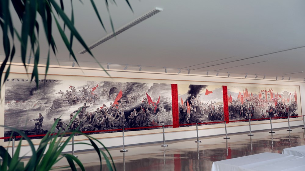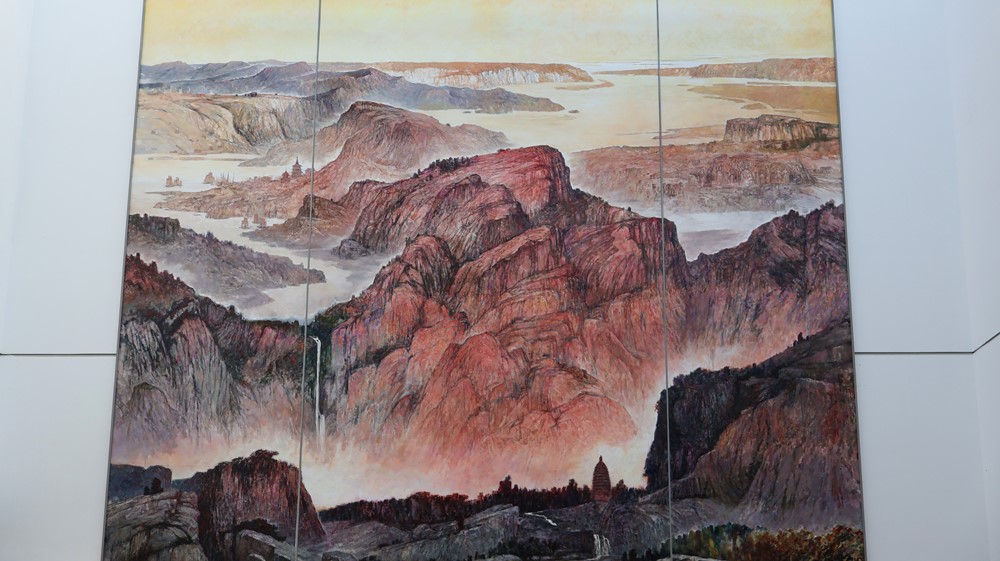 美術(shù)館內(nèi)部空間布局精妙,設(shè)有兩個專業(yè)展廳,總面積達1500平方米,為藝術(shù)家與觀眾搭建了一個交流、品鑒與靈感碰撞的平臺。其中,高達13.8米的穹庭懸掛著侯震老師的油畫巨制——《天下之中 九派莽莽》。這幅作品尺寸為11.8m×11.8m,以其宏大的敘事、細膩的筆觸和深邃的意境牢牢抓住大家的視線,成為每一位踏入美術(shù)館的訪客不可錯過的視覺盛宴。